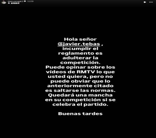 卡瓦哈爾寫道:“你好,特瓦斯先生,違反規(guī)則就是在扭曲比賽,您可以對RMTV的視頻發(fā)表任何看法,但不能忽視上述行為是違反規(guī)定的。如果比賽如期舉行,您的比賽將留下污點,下午好。”