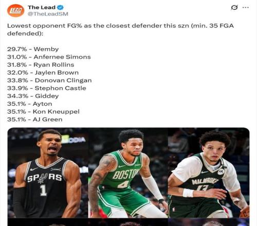 值得關(guān)注的是,文班亞馬還有2項(xiàng)數(shù)據(jù)高居聯(lián)盟第1。第1、文班亞馬場(chǎng)均送出4.8次封蓋,排名聯(lián)盟第1。第2、美媒The Lead列出了一項(xiàng)防守?cái)?shù)據(jù)統(tǒng)計(jì),本賽季在防守對(duì)位時(shí)讓對(duì)手投籃命中率最低的球員(至少防守35次出手)排行,其中文班亞馬(29.7%)排在第一。