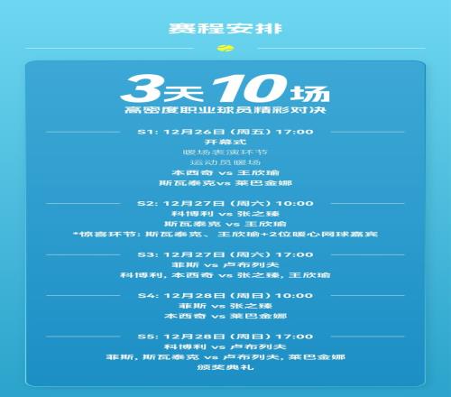 在圣誕與元旦之間的節(jié)慶間奏,以上8位網(wǎng)壇頂尖選手將齊聚2025世界網(wǎng)球洲際對(duì)抗賽(WTCC),連續(xù)三天為鵬城球迷奉上10場(chǎng)高密度對(duì)決。比賽項(xiàng)目涵蓋男子單打、女子單打、混合雙打,每場(chǎng)比賽采用三盤(pán)兩勝制。本屆賽事已于10月27日正式開(kāi)票,歡迎掃碼購(gòu)票。