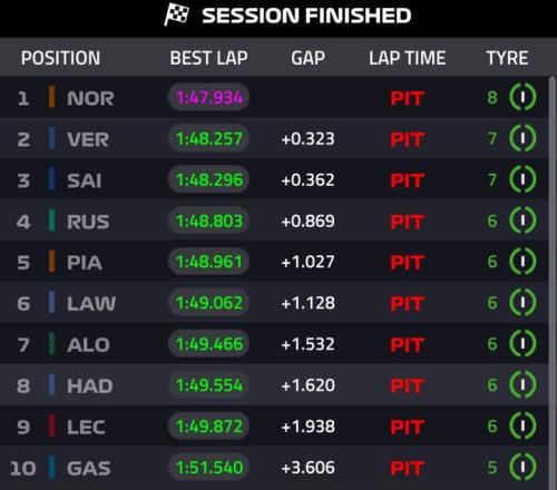 最終諾里斯取得桿位,維斯塔潘第二,塞恩斯第三,拉塞爾第四,皮亞斯特里第五,勞森第六,勒克萊爾僅僅位列第九。
