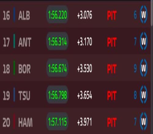 Q2上來(lái)皮亞斯特里一度刷紫,不過(guò)隨著賽道變干,勞森和哈賈爾先后來(lái)到榜首,諾里斯也反超皮亞斯特里來(lái)到第三的位置。Q2結(jié)束時(shí),拉塞爾沖到第一位,皮亞斯特里險(xiǎn)些被淘汰。被淘汰的是霍肯伯格、奧康、比爾曼、克拉平托以及用半雨胎跑了4圈的斯特羅爾。