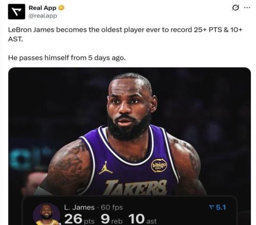 憑借這樣的表現(xiàn),41歲零11天的詹姆斯也超越5天前的自己,成為NBA歷史上單場(chǎng)拿到至少25+10助最老的球員。